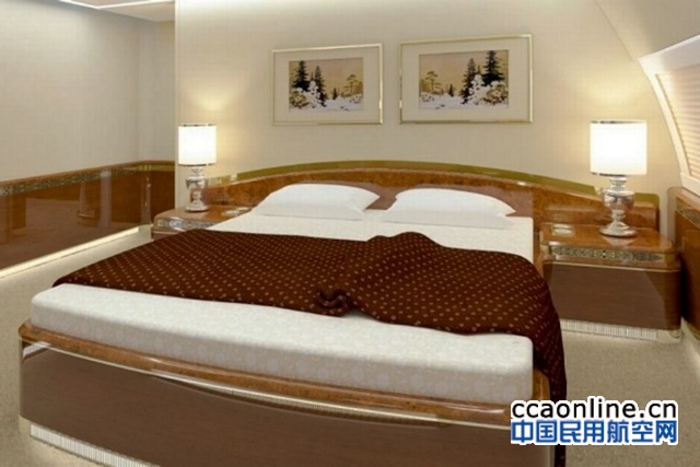 作为总统专机,普京的卧室也相当宽敞舒适。伊尔96大飞机为装修提供了足够的空间。