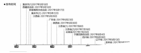 从发布时间上看,最早发布时间为2017年5月10日。当日有两份文件发布,分别为:重庆市公安局发布的《关于加强民用无人驾驶航空器飞行管理的通告》和中国人民解放军95561部队、西藏自治区公安厅、民航西藏自治区管理局发布的《关于加强西藏自治区军民航机场净空区域安全保护和“低慢小”航空器管理工作的通告》。