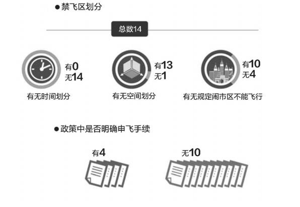 禁飞区划分方面,14份文件中都有相关规定。从时间上看,14份文件中均未对夜晚等危险多发时段的飞行进行特殊规定;从空间上看,有13份文件对禁飞区域有详细的规定,10份文件规定了闹市区(人口密集区域)不得飞行。