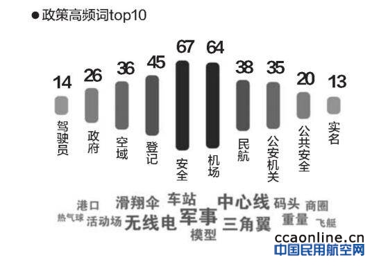 值得注意的是,南都记者通过技术软件对全国(截至2017年10月27日)公开报道中能查询到的上述14份无人机相关政策进行分析,政策内容中前十位的高频词由高到低分别为:安全、机场、登记、民航、空域、公安机关、政府、公共安全、驾驶员、实名。