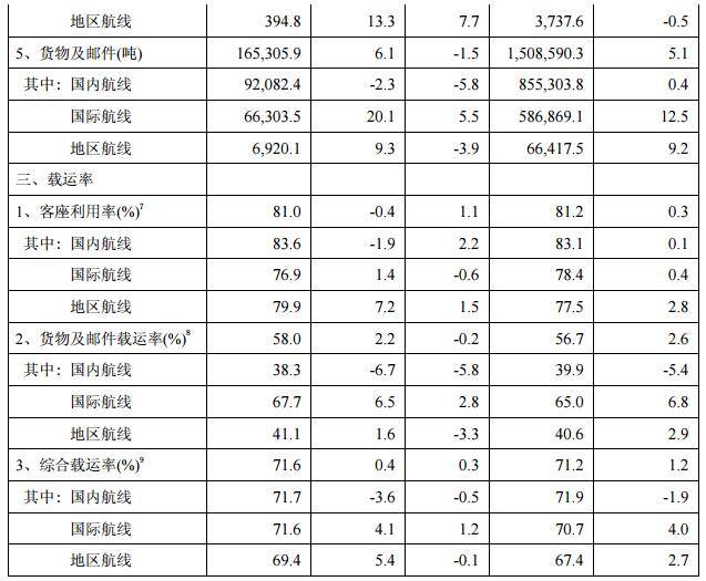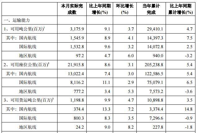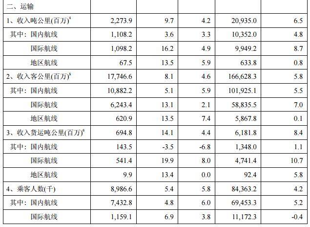 3、可用货运吨公里指飞行公里乘以可载货物及邮件吨位数量