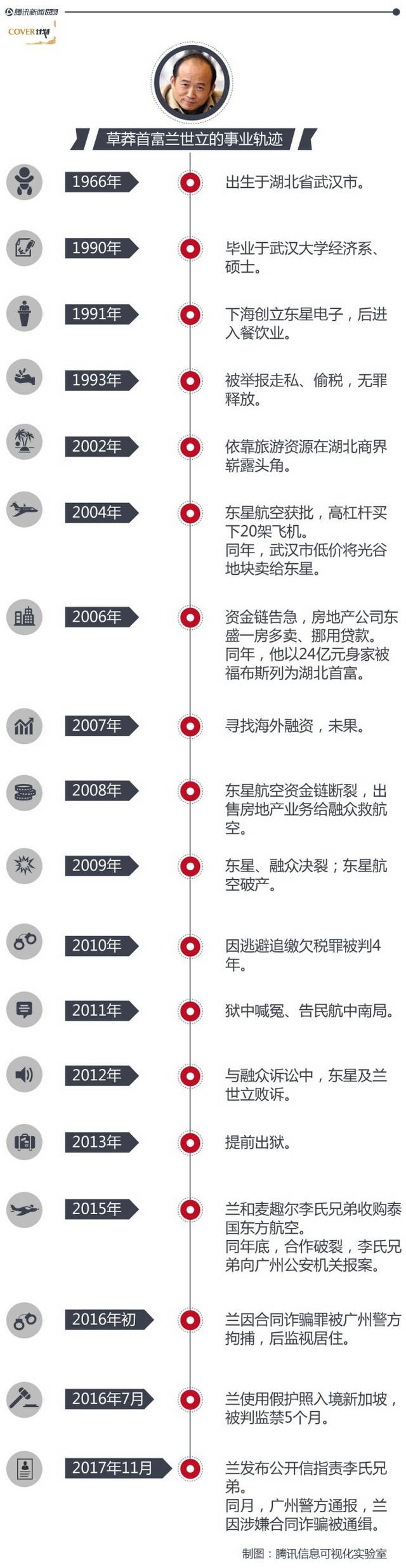 - 2009年,东星集团资金链彻底断裂,后武汉市中院以逃避追缴欠税罪判处兰世立有期徒刑4年。从“买飞机”走上人生巅峰到破产入狱,牟其中用了10年;兰世立只用了1021天。