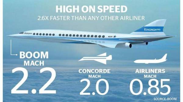 Boom公司的新型超音速客机概念目标是一种机票价格控制在与现行商务舱机票范围内,的55座级客机。该机将使用上世纪60年代,也就是著名的“协和”超音速客机开发时所无法企及的新型结构、航电和推进技术。这种采用三角翼和三发设计的飞机的飞行速度将比“协和”提高10%(2.2马赫),航程则可以大幅度超过前者,达到8300公里,大部分航程将在海洋上空,该机可能在21世纪20年代中期前交付使用。