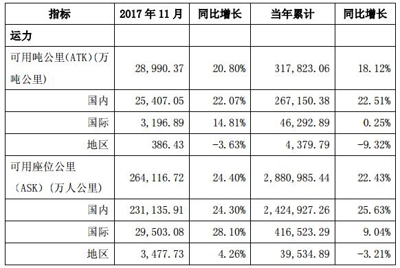 上海吉祥航空股份有限公司(以下简称“吉祥航空”或“公司”)及所属子公司九元航空有限公司(以下简称“九元航空”)2017年11月份合并主要运营数据: