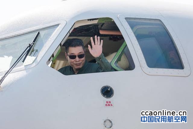 水陆两栖飞机AG600首飞机长赵生向地面人员挥手致意 摄影:陈肖