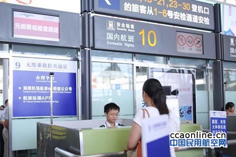 长沙黄花机场推出“无纸乘机”服务后,旅客可以通过湖南机场“航享e+”微信公众号(CSA96777)或“航旅纵横”APP办理值机选座。完成选座后,系统会自动生成一个附有登机二维码的电子登机牌。凭借手机上收到的电子登机牌,旅客就可以携身份证和手机,在安检口扫码完成验证,扫码后的电子登机牌会自动生成电子验讫标识,在舱门前,工作人员会进行二次复核。