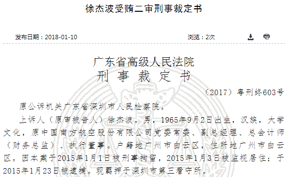 1月10日,裁判文书网公布南方航空原副总徐杰波受贿二审刑事裁定书。对徐杰波在职期间受贿近700万的违法事实,法院二审决定维持原判,判处徐杰波有期徒刑10年半,并处罚金100万元。