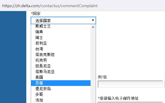 达美中文官网将“西藏”、“台湾”列入“国家”选项