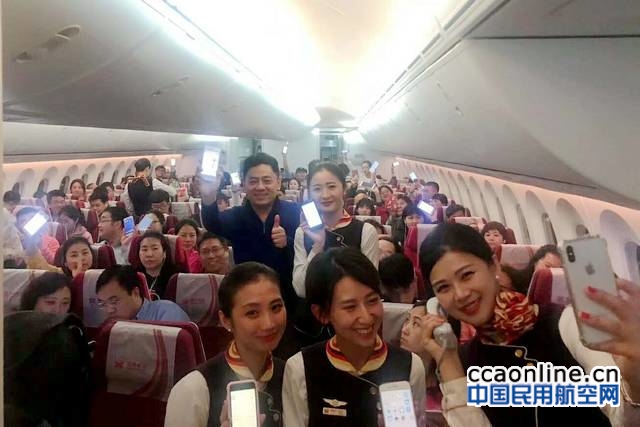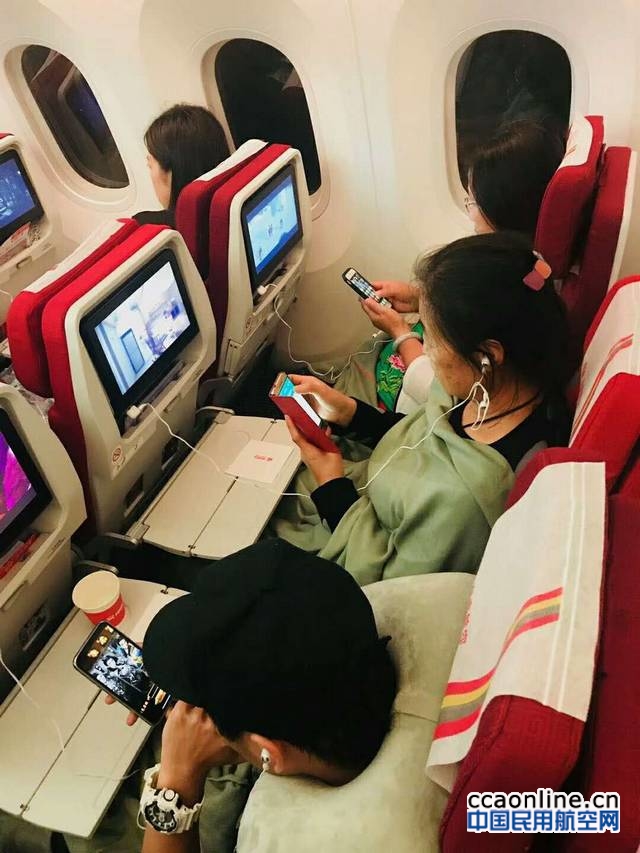在HU7781航班上,众多旅客纷纷拿起手机、平板电脑(Pad)等便携式电子设备(PED)体验并参与互动活动。作为PED开放第一批吃螃蟹的人,旅客文女士说:“没想到能这么快实现空中开放PED使用,而且机上使用体验也很棒,为海南航空点赞。”