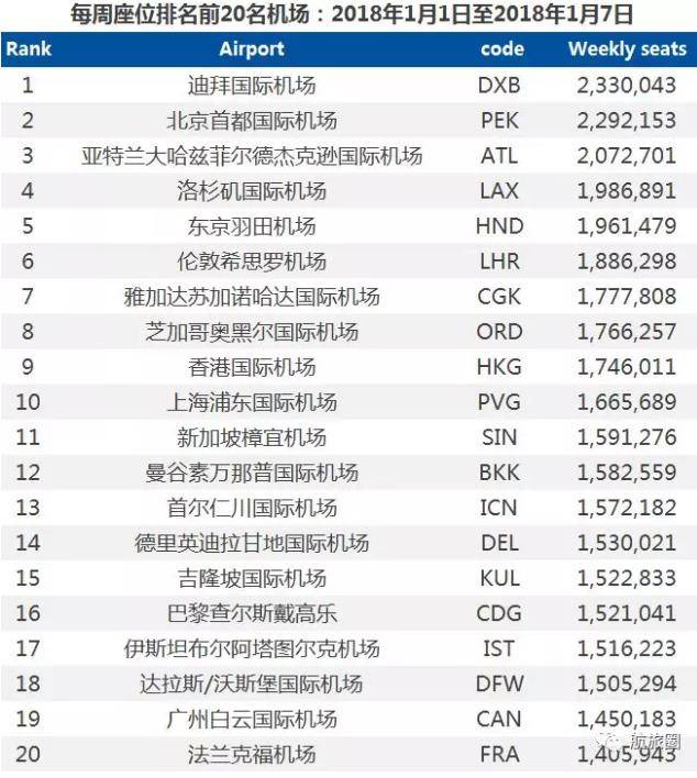 同样没有进入前20的还有阿姆斯特丹史基辅机场,史基浦机场年吞吐量在2016年就已突破6000万人次。其他18座旅客年吞吐量超过6000万人次的机场,则全部进入2018年第一周吞吐量前20。