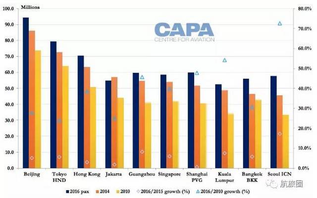 例如成都机场的旅客年吞吐量从2010年到2016年增长了78%,德里机场达到96%,昆明机场和胡志明机场更是翻了一番多。