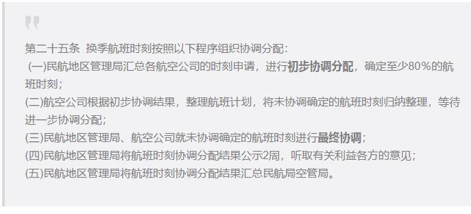 我们先来看看2010版时刻管理办法(51号文),共计11页40条,其中,对于“航班时刻怎么分配”这个核心内容,仅有第25条涉及。具体怎么说,我们来感受一下: