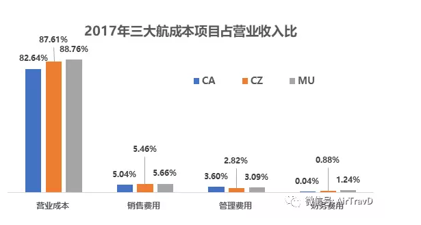 2017年,国航、南航与东航等三大航营业成本对营业收入的占比分别为82.64%、87.61%与88.76%,国航的营业利润率超过了15%,达到了17.36%;财务管理能力,国航最优,财务费用对营业收入占比仅为0.04%;销售费用占营业收入比例,国航也是最低;但管理费用占营业收入比例,国航由最高,达到了3.6%。