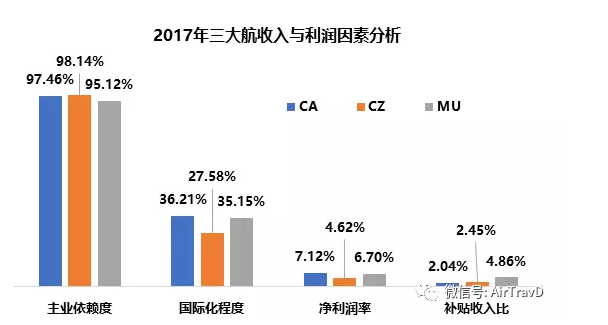 消费升级、高铁扩张、核心资源缺乏、航油成本小幅上升、人民币升值等众多因素,无疑是分析航空公司业盈利能力的重要依据。但在同质化发展与高度集中的航空公司业,这些因素对各公司的影响几乎是共同的,唯有不同的是各公司自身的管理能力、运营效率与成本控制能力等。2017年,三大国有航空公司的营业收入规模都已超过千亿,标志着中国航空公司发展步入新的竞争格局。虽然都为国有企业,但在细节上仍然有诸多不同。