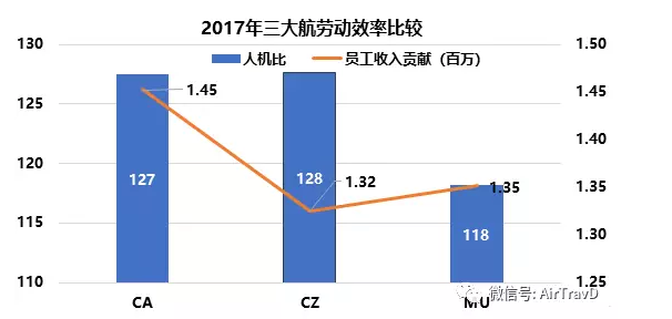 2017年,国航、南航、东航的机队规模分别为655架、754架与637架;在职员工数分别为83506人、96234人和75277人。人均收入贡献,国航最高,达到了1.45百万元人民币;人机比,国航与南航相近,东航最低,单架飞机对应的员工数仅为118人。