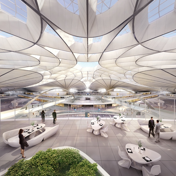 新机场的造型像一束花朵,每个指廊都可以看作是一片花瓣,阳光从花朵顶部延伸到各个花瓣,洒在室内的每一个角落,塑造出明亮的室内印象。