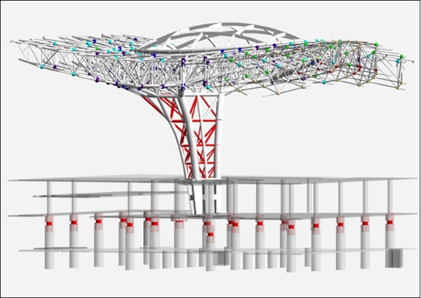 航站楼核心区屋顶屋盖钢结构投影面积达18万平方米,主要以8根C型柱及12根塔柱就把中心区的屋顶支撑起来。C型柱上宽下窄,底部最窄处只有3米,顶端最大跨度达23米,造型灵动。这些柱子既是支撑构件,又是室内采光的窗口,自然光从C型的敞口中倾泻而下,形成巨大的光瀑。C型柱间距200米,中间的无柱空间可以完整装下整个水立方,更多空间被用于服务旅客,而不是被结构所占据。