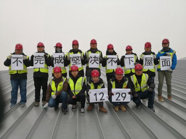 2017年12月29日,主航站楼封顶冲刺,几名屋面工作人员一起合了张影,他们每人拿着一个字,共同喊出:不完成坚决不下屋面。寒风凛冽,每个人的眼睛里都写着坚定。