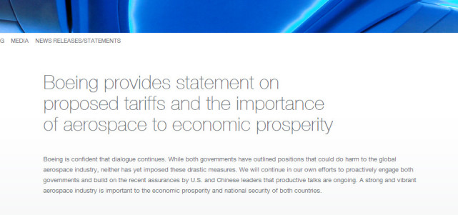 4月5日,美国飞机制造商波音在其官网发布一份有关“拟加征关税和航空航天对经济繁荣重要性”的声明,全文如下: