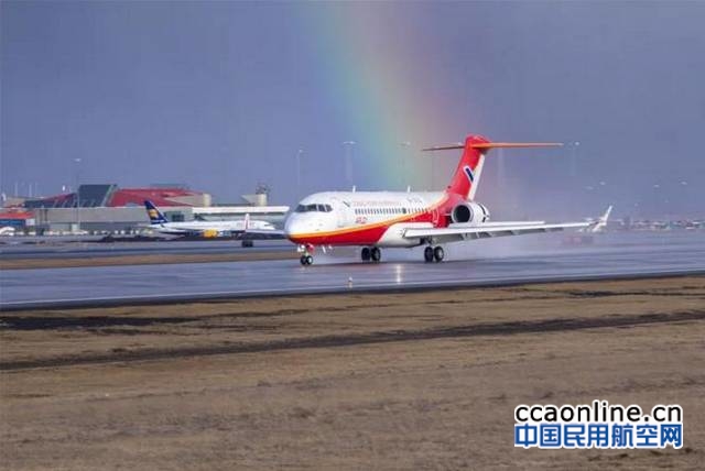 3月26日,中国民航局试飞员赵志强、中国航空工业集团试飞中心试飞员陈明驾驶着ARJ21飞机104架机在冰岛凯夫拉维克国际机场执行了6个起飞和6个着陆。