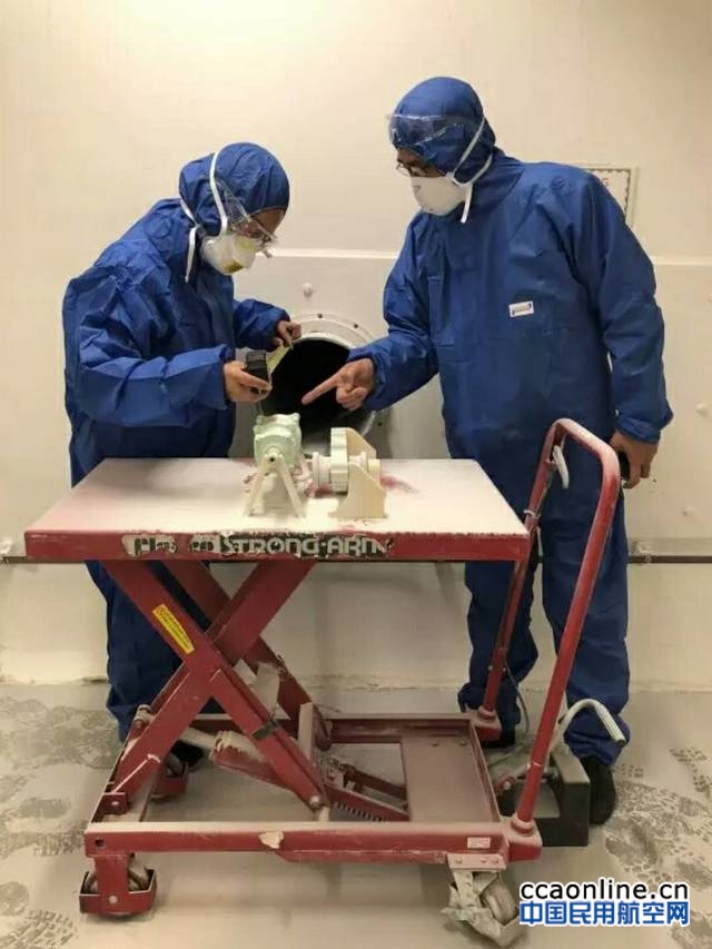 在实施了试验件验收试验的制造符合性检查后,重要的一环是不同工况下试验前制造符合性检查。即便穿戴了厚厚的防尘服、口罩和护目镜,实验室内持续不断的砂尘还是呛得让人喘不过气来,随时都有粉尘吸入肺部的威胁,但为了获取最真实可靠的试验测量数据,审查代表坚持在每一次更换试验件方向的间隙,都进入实验室检查,确保试验全过程不同工况下试验件的安装、砂尘温湿度速度均满足试验大纲要求。