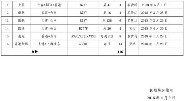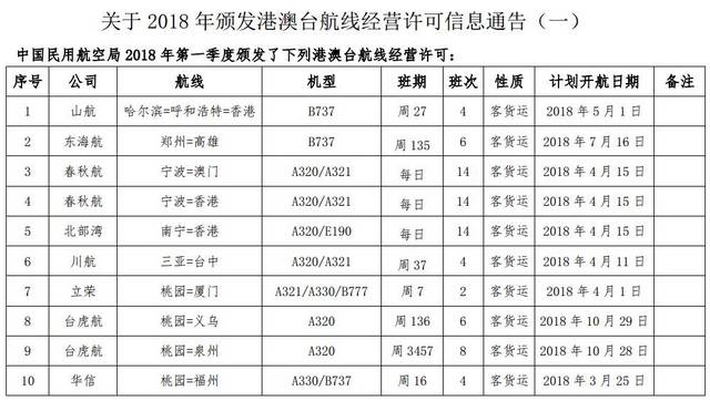 民航局发布2018年一季度港澳台航线经营许可 新闻推荐 航空运输头条 头条 局方公告 18年4月10日 编辑 编辑005 取消关注 关注 私信 中国民用航空网讯:4月9日,民航局发布《关于2018年颁发港澳台航线经营许可信息通告(一)》,共16条航线获批,具体信息如下: 航线民航局民航政务公告时政新闻