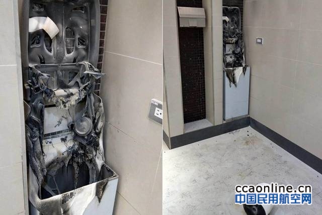 4月12日凌晨2时55分,第二航站楼管制区外三楼出境大厅5号报到柜台前的男厕出现火警讯号,机场公司巡场人员立即赶赴现场处理,并迅速以灭火器扑灭闷烧冒烟中的擦手纸机。挂在厕所墙上的擦手纸机被烧到变形完全看不出原样,塑胶外壳融化,墙面上还留下浓烟燻过的黑色痕迹。