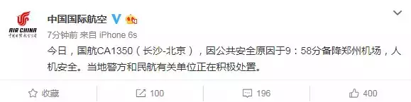 今日,国航CA1350(长沙-北京),因公共安全原因于9:58分备降郑州机场,人机安全。当地警方和民航有关单位正在积极处置。