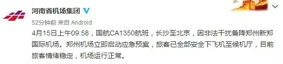4月15日上午09:58,国航CA1350航班,长沙至北京,因非法干扰备降郑州新郑国际机场。郑州机场立即启动应急预案,旅客已全部安全下飞机至候机厅,目前旅客情绪稳定,机场运行正常