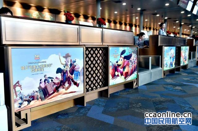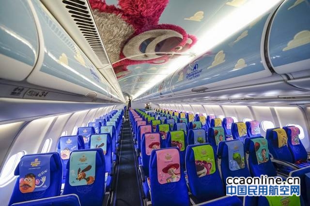这是中国大陆地区第一架将机身外涂装、机舱内装饰以及机场主题场景完美融合的主题航班。机舱顶部、行李架、座椅头片等地方随处可见丰富的玩具总动员主题元素,色彩缤纷的小桌板突出呈现了新园区的全新景点,屏幕中还播放着全新宣传片。