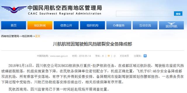 民航西南管理局发布消息,2018年5月14日,四川航空公司3U8633航班执行重庆-拉萨航班任务,在成都区域巡航阶段,驾驶舱右座前风挡玻璃破裂脱落,机组实施紧急下降。在民航各保障单位密切配合下,机组正确处置,飞机于07:46分安全备降成都双流机场,所有乘客平安落地,有序下机并得到妥善安排。备降期间右座副驾驶面部划伤腰部扭伤,一名乘务员在下降过程中受轻伤。川航已协助旅客安排后续出行,相关后续保障有序开展。
