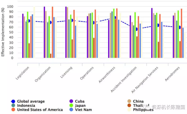 横轴分别是法规、组织、执照、运行、适航、事故调查、空中航行服务、机场等。