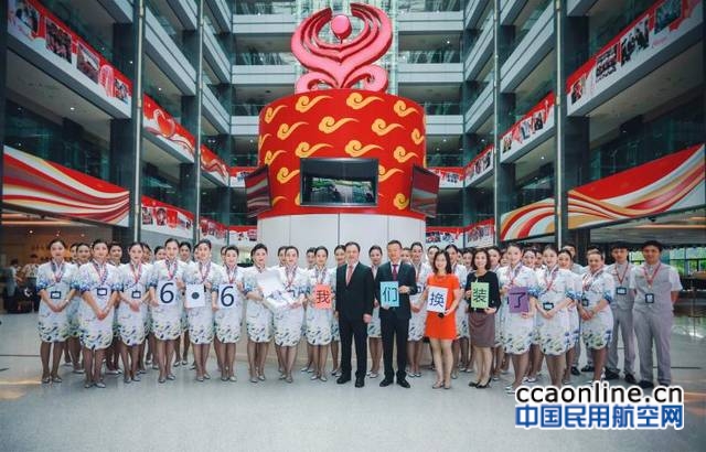 海南航空总裁徐军、人力资源总监权栋与海南航空乘务员代表合影(摄影 宁隆宇)
