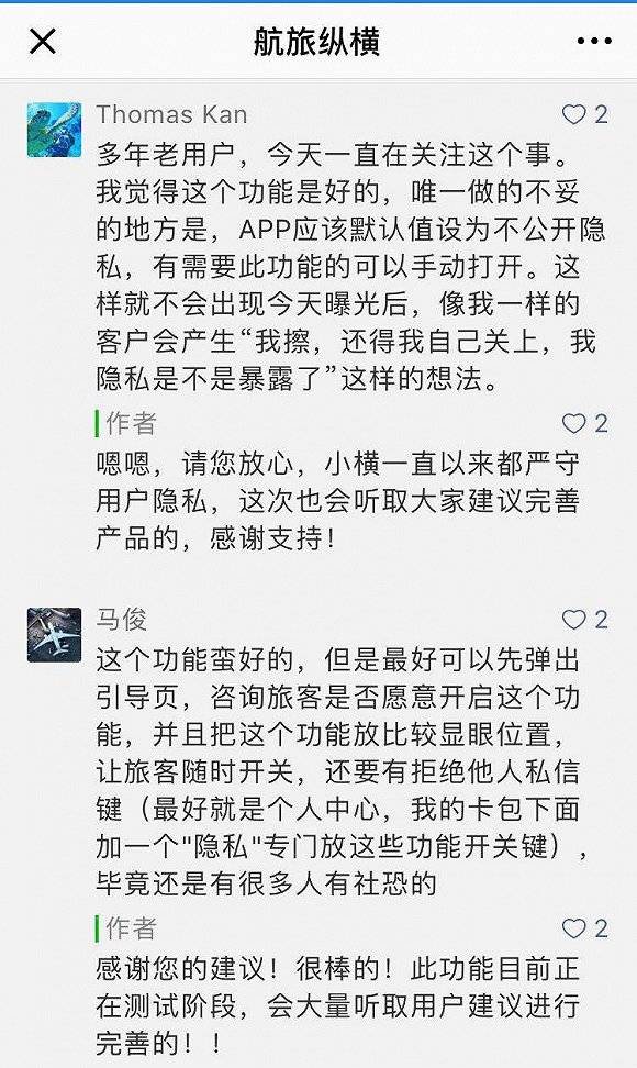 有用户在航旅纵横的微信文章后留言,提到应该默认设置为不开启以及提示不明显的问题,航旅纵横的回复默认了这些问题的存在。