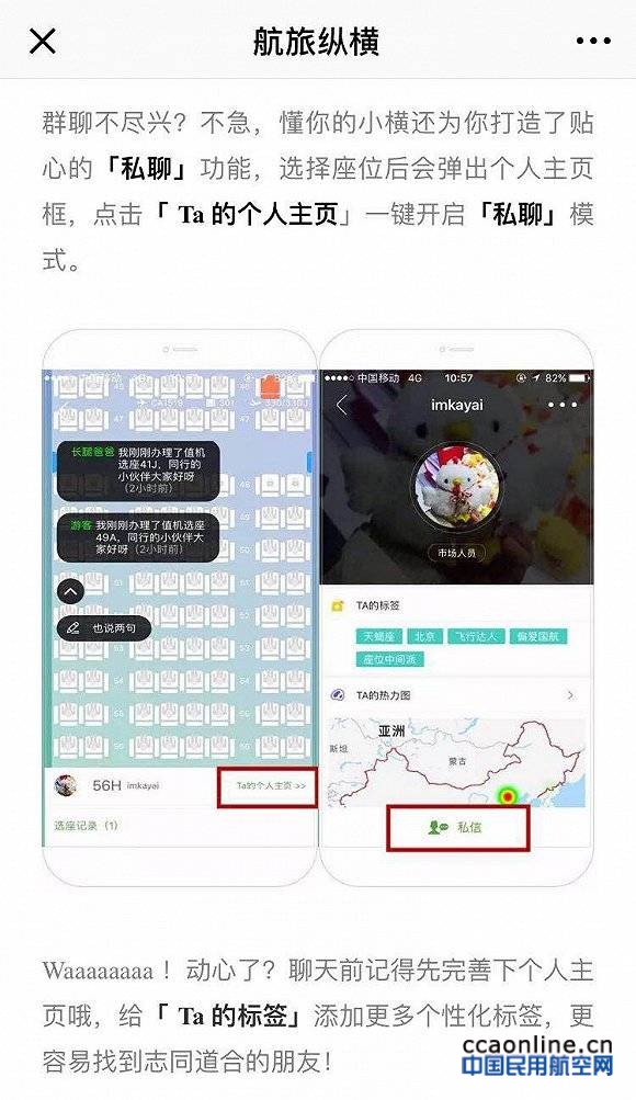 推文中提到,同机乘客可以在选座页面进行群聊,还可以点击用户主页进行私聊,同时能为其他乘客添加个性化标签。