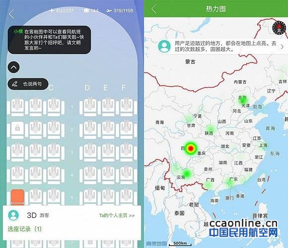 记者通过一位航旅纵横的用户查看了此功能。这位乘客5月份曾从成都飞往丽江,在航旅纵横APP中进行了选座。选座页面上,点击其它已选的座位,下方会出现“Ta的个人主页”,点击进去可查看该用户的飞行热力图。
