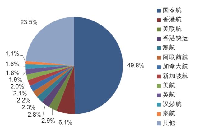 截至2017年已有100多家航空公司在香港市场投入运力,其中国泰航空集团运力份额高达49.8%,远远领先其他公司,位居第二的香港航空运力份额仅为6.1%