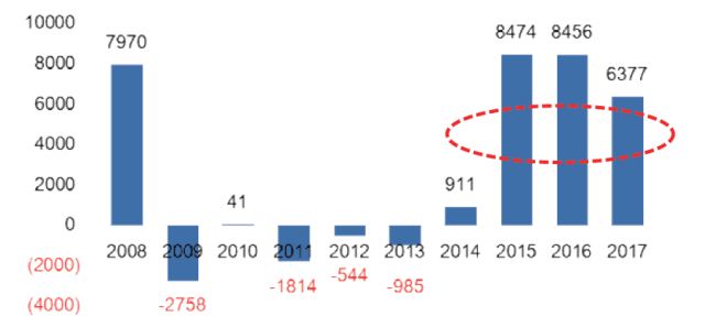 2008-2017年,国泰航空集团累计运力投入呈上升趋势,除2009年与2013年出现下降,其他年度运力投入保持正向增长。2017年运力投入仅增长2.8%,相比2014年和2015年运力增速已有较大降幅: