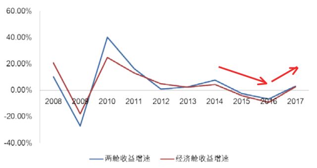 国泰航空集团的高舱(包括头等舱与商务舱)收益从2015年开始持续下降,2016年高舱收益与经济舱收益降幅继续探底,高舱收益下降6.6%、经济舱收益下降9.2%。在2017年高舱与经济舱收益均有所恢复,分别增长3%、2.6%,但增速缓慢,仍不及2014年及以前增速: