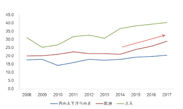 2015-2017年国泰航空集团欧洲市场运力年均复合增速高达10%,而北美市场、西南太平洋与南非市场年均复合增速仅为2.7%和2.9%: