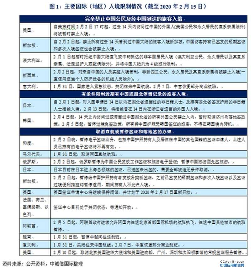 截至2月15日,完全禁止中国公民及经中国到达的旅客入境的国家(地区)共15个;有条件限制近期有中国或湖北停留记录的旅客入境的国家(地区)共20个;取消直航或暂停签证和落地签办理的国家(地区)共11个;另有48个国家(地区)要求加强对中国籍及来自中国的所有国籍乘客的入境检查,并填写健康申报表。突发疫情导致跨国商务、出境游等国际航线需求明显收缩,国内大型航司国际航线比重较大,国际业务收入及利润在短期内将受到较大冲击。