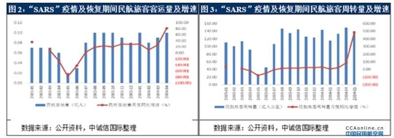 “非典”之前的2003年一季度,中国民航运输总周转量、旅客运输量和货邮运输量同比分别增长17.8%、14.1%和15.1%。但在“非典”发生后的4月20日以后,民航旅客运输量开始大幅下降,当月我国民航完成旅客运输量0.06亿人次,旅客周转量91.37亿人公里,同比分别下降25.7%和17.1%。与2020年春运处理疫情类似,2003年中国取消五一小长假,严重影响了国内外旅游市场,大量航班遭取消,亚太地区旅客周转量同比下降50%,可用座位公里同比下滑40.7%。2003年第二季度,中国民航旅客运输量同比下降48.9%,其中5月份下降78%;载运旅客人数同比减少约1,000万人,损失运输收入近100亿元。根据航司财务报表,2003年前三季度,中国国航(7.750, -0.14, -1.77%)、东方航空(4.710, -0.14, -2.89%)和南方航空(5.970, -0.12, -1.97%)累计亏损分别为8.2亿元、11.93亿元和7.83亿元。至2003年9月,全球客运周转量首次恢复正增长,由此全球航空业基本走出非典影响,历时8个月。