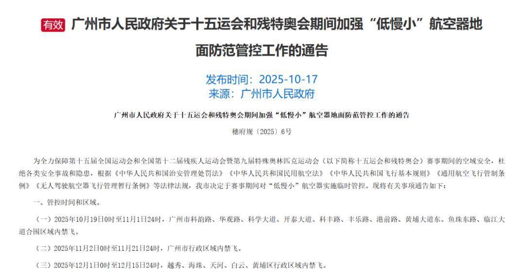 OCR:有效广州市人民政府关于十五运会和残特奥会期间加强“低慢小”航空器地 面防范管控工作的通告 发布时间:2025-10-17 来源:广州市人民政府 广州市人民政府关于十五运会和残特奥会期间加强“低慢小”航空器地面防范管控工作的通告 德附现12025厂6号 为全力保障第十五届全国运动会和全国第十二届残疾人运动会暨第九届特殊奥林匹克运动会(以下商称十五运会和残特类会)赛事期间的空域安全,社 绝各类安全事放和隐惠,根据(中华人民共和国治安管理处罚法)《中华人民共和国民用航空法)《中华人民共和国飞行基本规购》《通用航空飞行管制条 》(无人驾驶航空器飞行管理暂行条例》等法律法规,我市决定于赛事期间对“低慢小”航空器实施临时管控。现将有关事项通告如下: 、管控时间和区域。 (一)2025年10月19日0时至11月1日24时,广州市科韵路、华观路、科学大道、开泰大道、科丰路、丰乐路、港前路、黄埔大道东、鱼珠东路、临江大 道合围区域内禁飞 (二)2025年11月2日0时至11月21日24时,广州市行政区城内禁飞 (三)2025年12月1日0时至12月15日24时,越秀、海珠、天河、白云、黄埔区行政区域内禁飞。