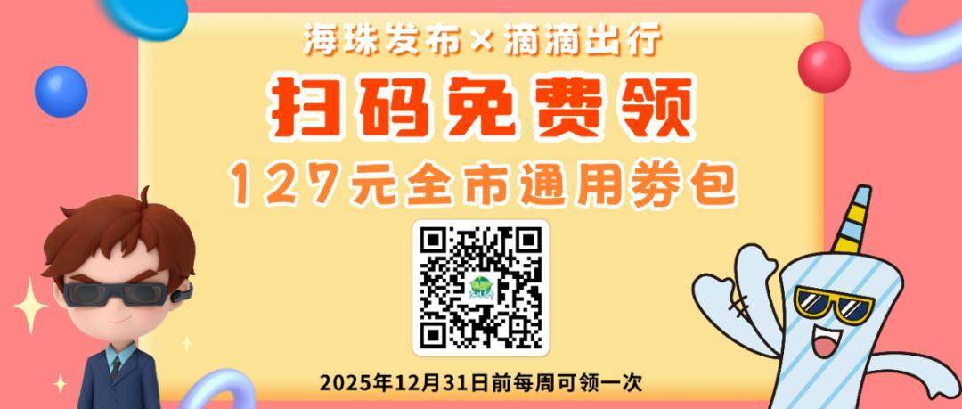 OCR:海珠发布X滴滴出行 扫码免费领 127元全市通用券包 2025年12月31日前每周可领一次