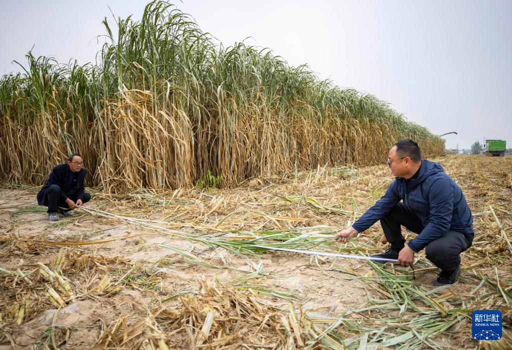 10月23日,在宁夏银川市永宁县闽宁镇园艺村,技术人员测量巨菌草的生长数据。