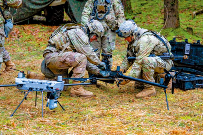 图:美国士兵在德国南部霍恩费尔斯训练区操作一架Anduril公司研发的无人机。法新社