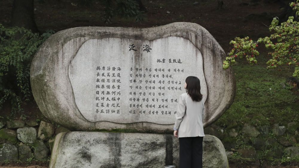 10月16日,游客在韩国庆州的“上书庄”前欣赏崔致远的代表作《泛海》。