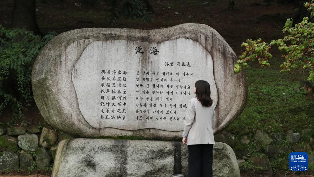 10月16日,游客在韩国庆州的上书庄前欣赏崔致远的代表作《泛海》。新华社记者姚琪琳摄
