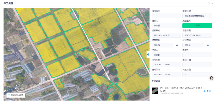 OCR:AI工具箱 X 项目名称 提取名称 油菜模型影像精度测试-1 提取人 提取进度 余陈 100% 提取开始 提取结束 2025-05-16 18:00 2025-05-16 19:41 提取面积 校对面积 900.24 932.61 校对人 复核人 余陈豪 校对开始 复核开始 2025-05-17 09:42 校对结束 复结束 2025-05-17 09:47 关联影像 PT-FYR5-1NKWLK-FM01-20250327-9RO-2 K-2.tif 下载 口显示校对痕迹 25-0327FM080-2-JD.tif