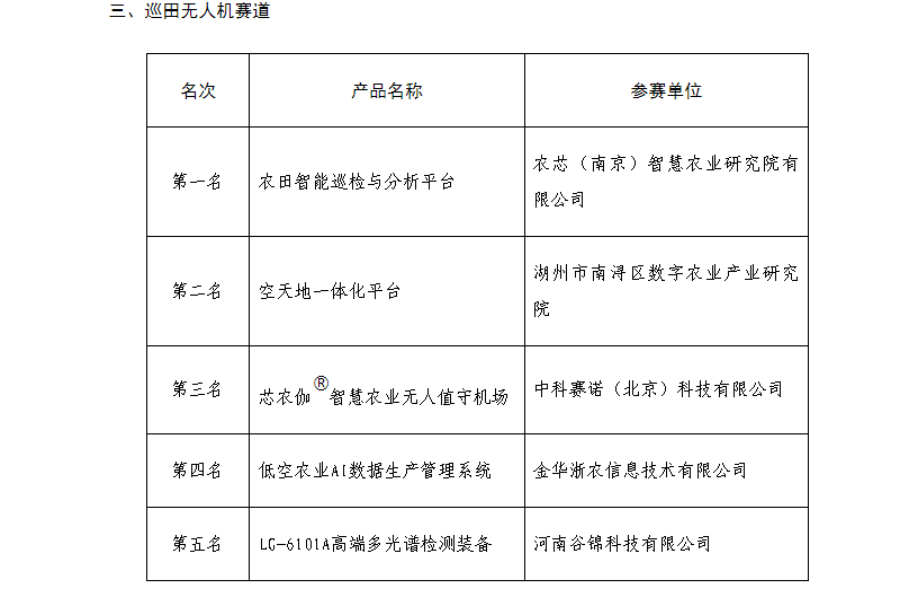 OCR:三、巡田无人机赛道 名次 产品名称 参赛单位 农芯(南京)智慧农业研究院有 第一名 农田智能巡检与分析平台 限公司 湖州市南浔区数字农业产业研究 第二名 空天地一体化平台 院 第三名 芯农伽智慧农业无人值守机场 ? 中科赛诺(北京)科技有限公司 第四名 低空农业AI数据生产管理系统 金华浙农信息技术有限公司 第五名 LC-6101A高端多光谱检测装备 河南谷锦科技有限公司